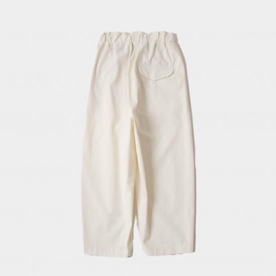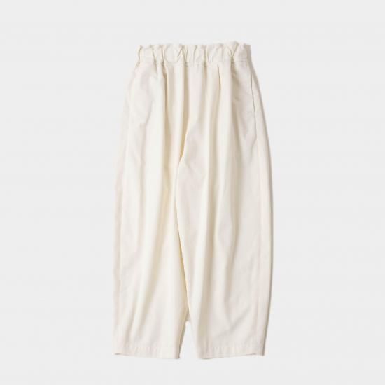 脇に丸みがあり、裾近くで強くテーパードしたフルレングスのパンツ。