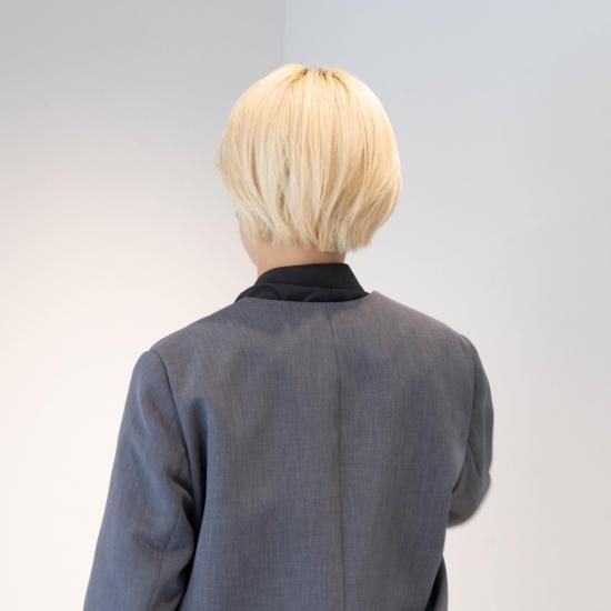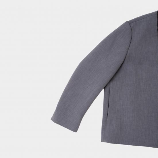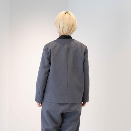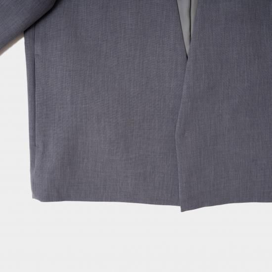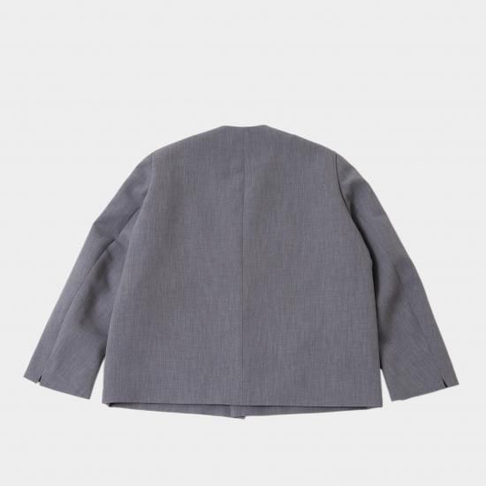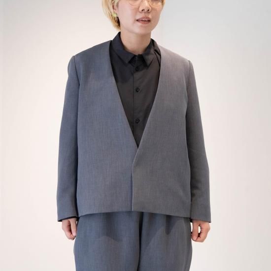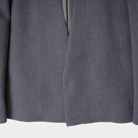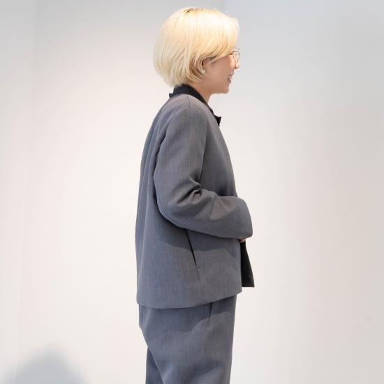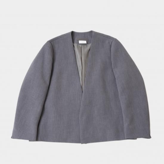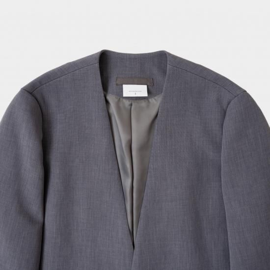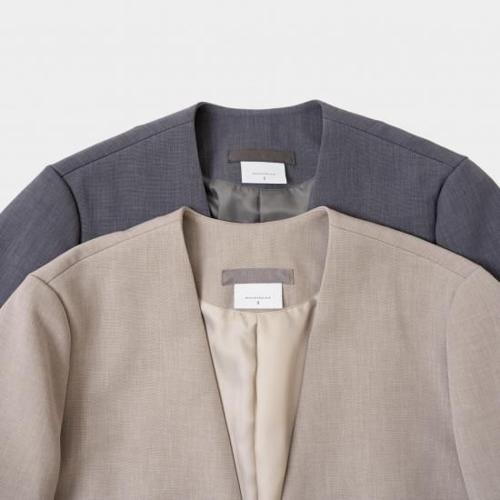 ジャスト肩で着丈短めのノーカラージャケットです。