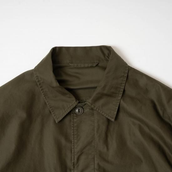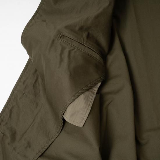 身幅とアームホールはゆったりしたミリタリーウエアらしいシルエットを意識していますが、コートの中に忍ばせることも考えコンパクトなバランスに仕上げ、胸ポケットも排除することでスッキリとした面構えにしています。