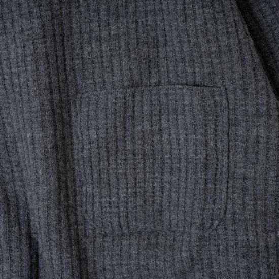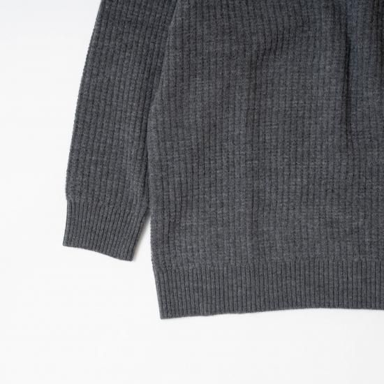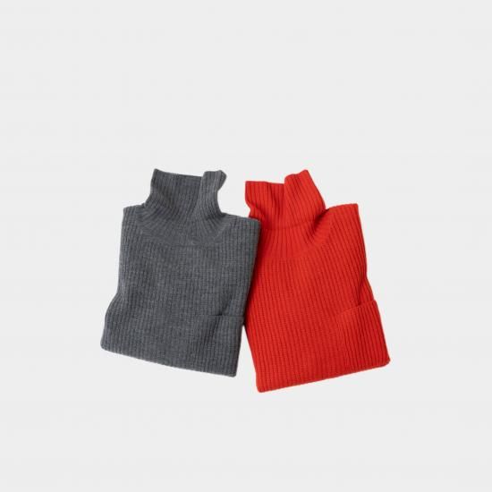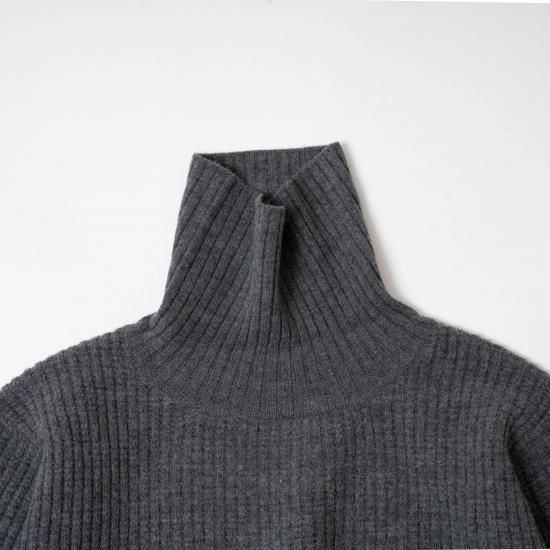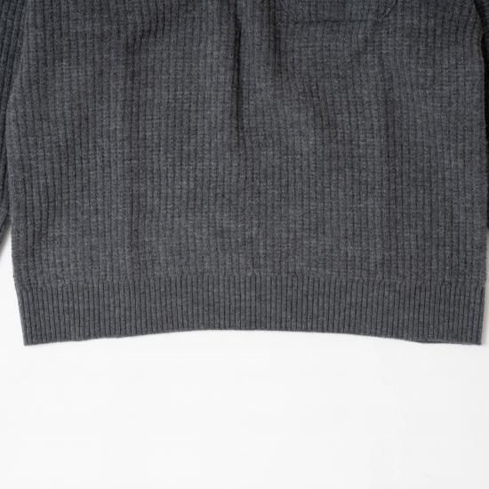 タートルネックの折り返さない版の様なイメージで設定した襟の雰囲気と、ニットでは珍しい胸ポケットがポイントのアイテムです。